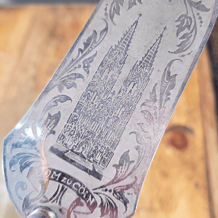 Schöner Kuchenheber aus Metall mit dem Motiv des Dom zu Köln. Die schicke Kuchenschaufel hat ein wirklich besonderes Design für alle Köln Fäns. Das aufwändige Dekor ist in den Kuchenheber graviert. Der Kölner Dom ist rundherum mit schönen Ranken verziert. Ein tolles Vintage Stück für alle die gern bei Kaffee und Kuchen ein bisschen plauschen.