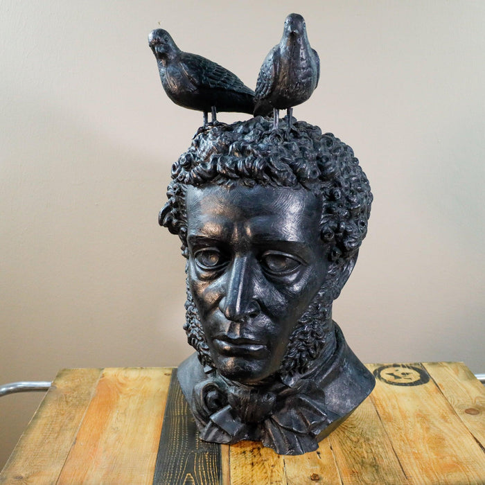 Alexander Pushkin sculpture, head: A special unique piece! It is a replica of Alexander Pushkin's head. The monument with this exact head is in Saint Petersburg and depicts the famous poet Alexander Pushkin. The monument is always occupied by pigeons, so this head also has birds on its head. The head is made of fiberglass, it is relatively light and hollow inside. It is an extremely decorative unique piece for literature lovers.