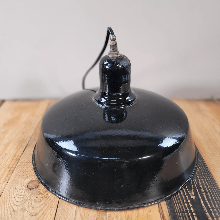 Tolle Industrie Deckenlampe aus einer alten Werkstatt. Die Lampe aus schwarzer Emaille ist in einem guten Vintage Zustand. Innen befindet sich eine E 27 Fassung. Die Hängelampe kann sofort  angeschlossen werden. ein schönes Stück Industriegeschichte.