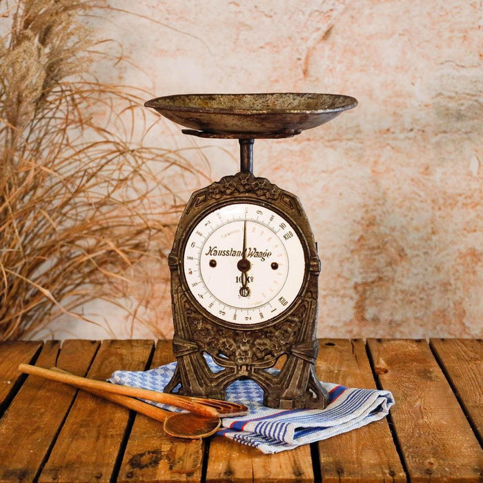 Great, rustic household scales, or as you can read "household scales" made of heavy metal. The very old scale is fully functional and can be adjusted again and again using a small wheel. The perfect scale for the country house kitchen, and for people who would like to weigh manually again. The scale weighs food up to 10kg. It has a matching bowl. The scale is not calibrated and has some signs of wear.