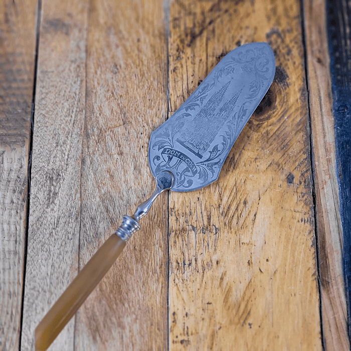 Schöner Kuchenheber aus Metall mit dem Motiv des Dom zu Köln. Die schicke Kuchenschaufel hat ein wirklich besonderes Design für alle Köln Fäns. Das aufwändige Dekor ist in den Kuchenheber graviert. Der Kölner Dom ist rundherum mit schönen Ranken verziert. Ein tolles Vintage Stück für alle die gern bei Kaffee und Kuchen ein bisschen plauschen.