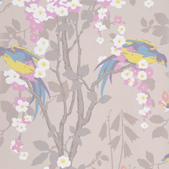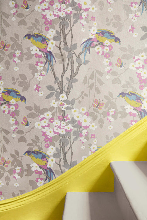 The surface-printed design of this wallpaper impresses with exotic lorikeets and an oriental flower. It was inspired by a striking 20th century work of art on display at the Whitworth Art Gallery in Manchester. The exotic theme and almost symmetrical repetition are typical of designs from the 1930s.