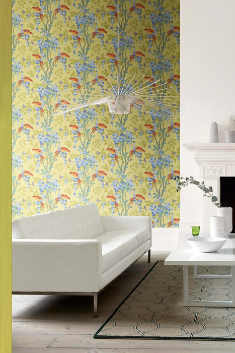 The surface-printed design of this wallpaper impresses with exotic lorikeets and an oriental flower. It was inspired by a striking 20th century work of art on display at the Whitworth Art Gallery in Manchester. The exotic theme and almost symmetrical repetition are typical of designs from the 1930s.