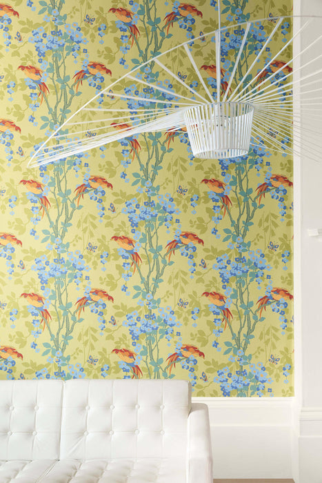 Although redesigned to suit today's interiors, the color schemes chosen are a testament to the use of bright colors commonly used in the 1930s. The beautiful wallpaper is available in five color combinations.
