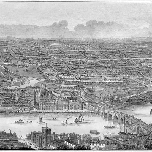 Thames Border is a fascinating recreation of a historic panorama of the British capital published in 1851 by the weekly magazine The London Illustrated News. It is an enlarged reproduction that shows a detailed representation of the buildings and landscape along the Thames at that time. The panorama is hand-drawn and was designed to fit any wall width by using a repeating part.
