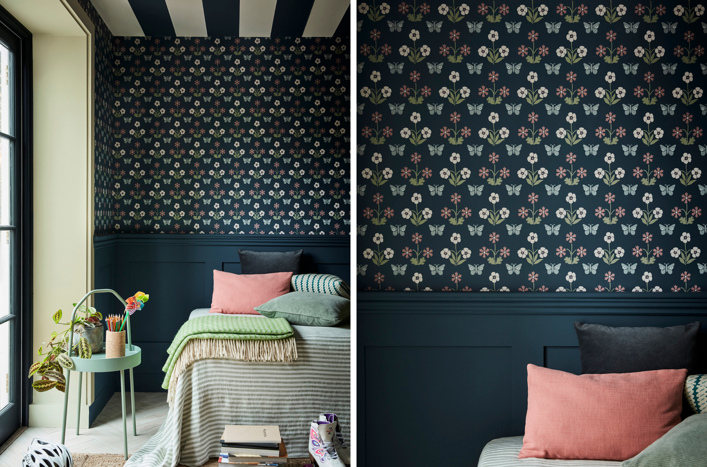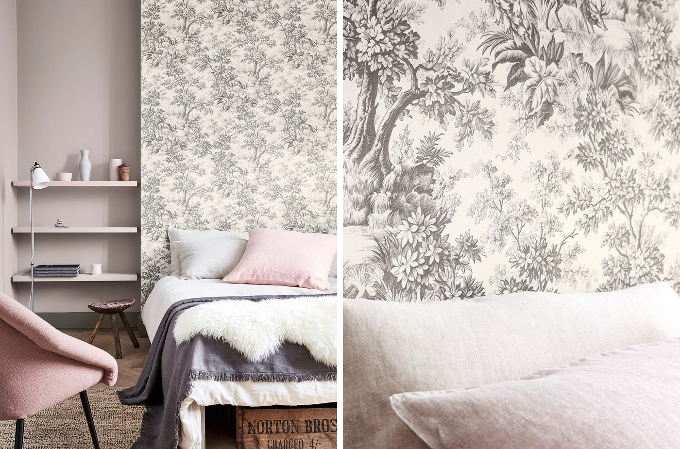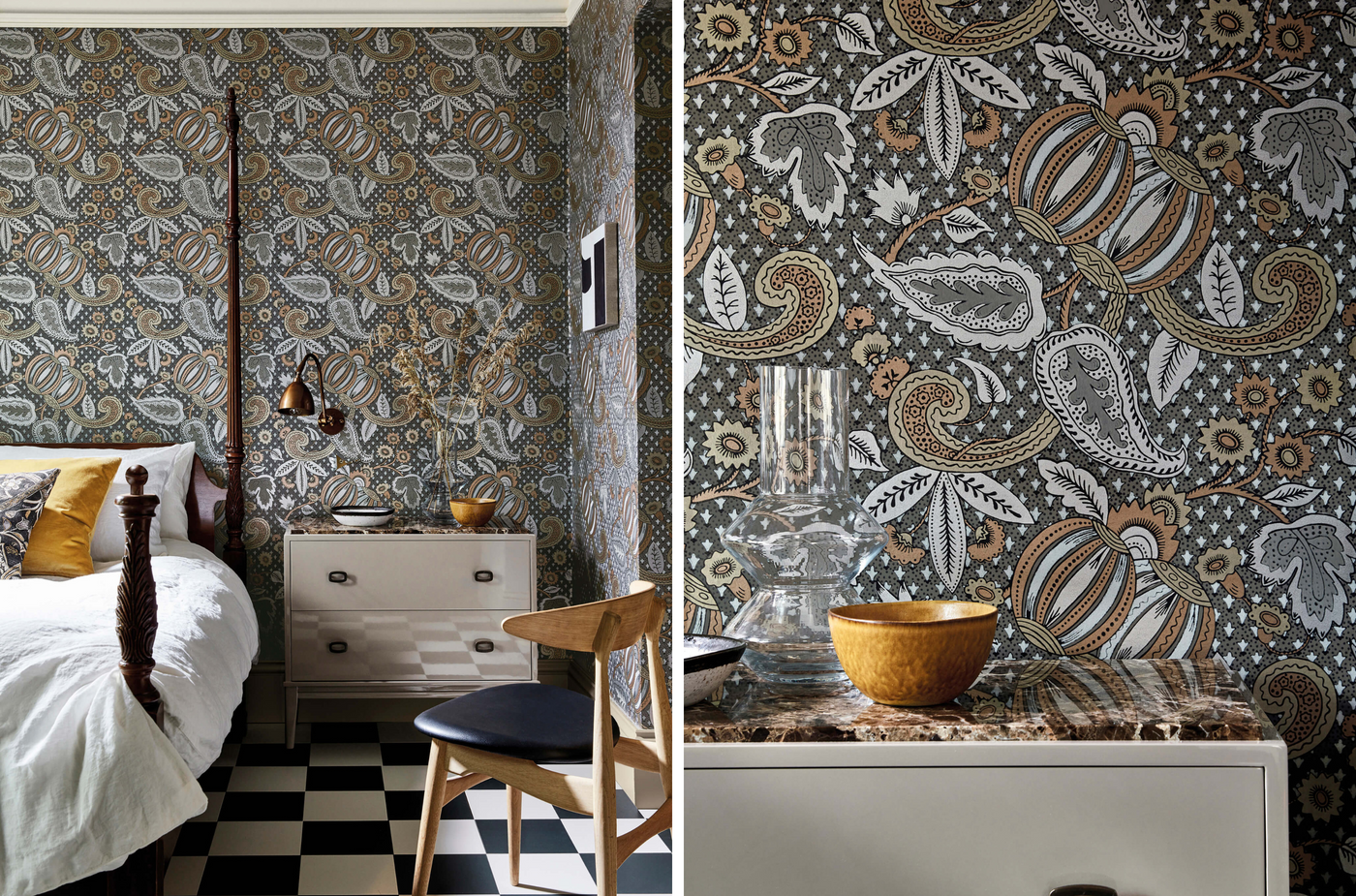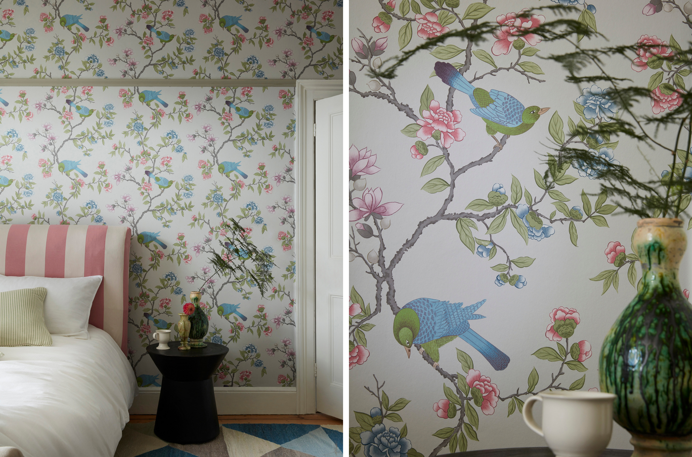 Dieses extravagante, lebhafte Pfauendesign ist ein wunderschönes Beispiel für den Tapetendruck des späten 19. Jahrhunderts. Es wurde an einer Wand einer Lobby der Erddig Hall in Wales gefunden, in den 1870ern dort angebracht und besitzt das malerische Finish traditioneller chinesischer Seide. Das Muster zeigt Pfaue auf Zweigen sowie Blüten, Blätter und andere Vögel und ist typisch für Tapeten und Stoffe, die für die westliche Elite und ihre Begeisterung für chinesisches Design hergestellt wurden. Diese Tapete ist in acht lebhaften Farbgebungen erhältlich, darunter elegant blass und intensiver gefärbt, mit dunklem Untergrund und sogar in schimmerndem Gold.