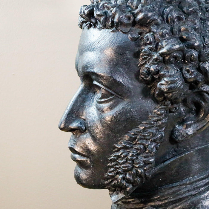 Alexander Pushkin sculpture, head: A special unique piece! It is a replica of Alexander Pushkin's head. The monument with this exact head is in Saint Petersburg and depicts the famous poet Alexander Pushkin. The monument is always occupied by pigeons, so this head also has birds on its head. The head is made of fiberglass, it is relatively light and hollow inside. It is an extremely decorative unique piece for literature lovers.