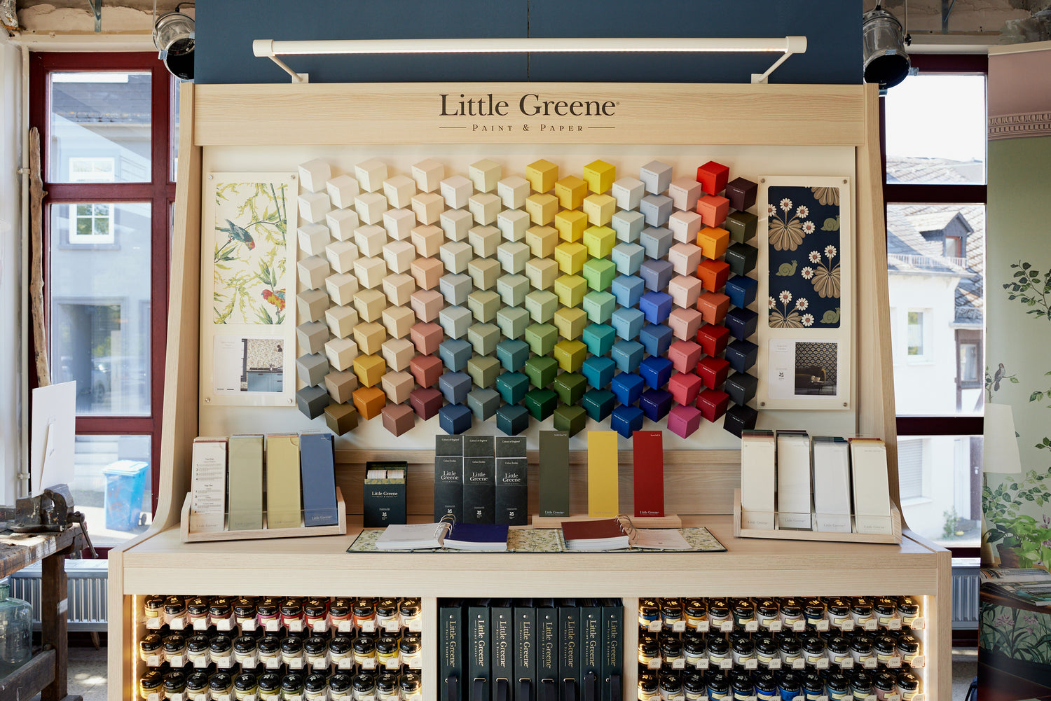 Ja. Wir haben große Musterbücher, in denen du die Tapeten anschauen und befühlen kannst, sowie eine Little-Greene Farbwand mit Farbkarten und Mustern, die du direkt an die Tapeten halten kannst, um zu schauen ob Sie zueinander passen.