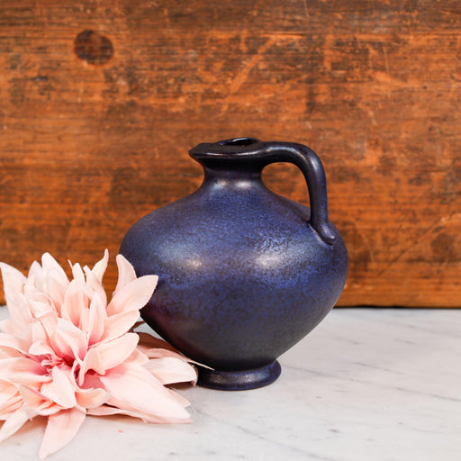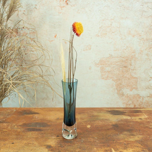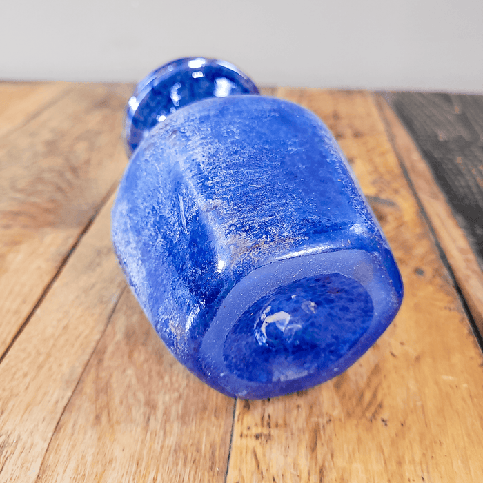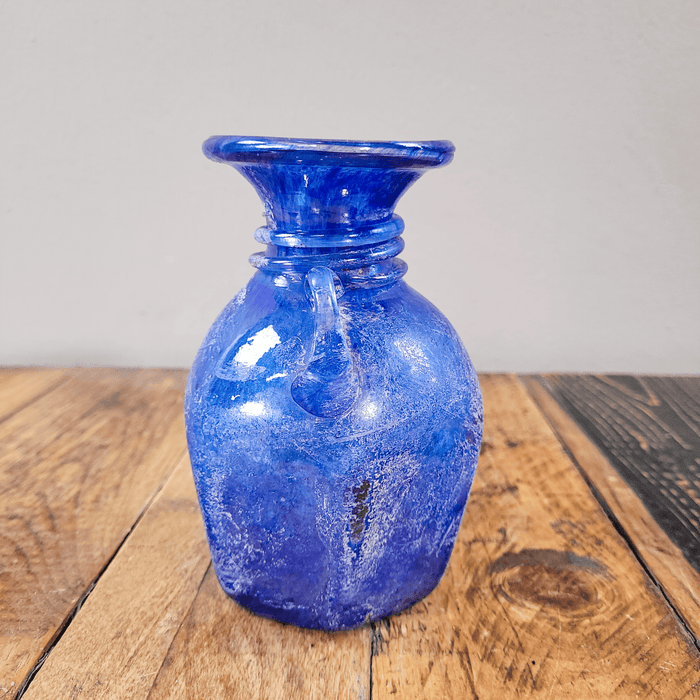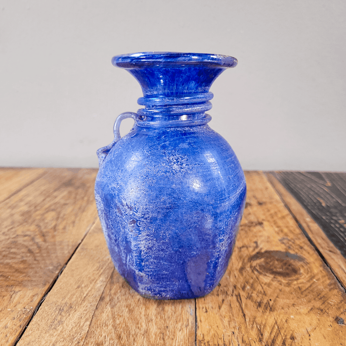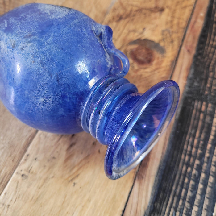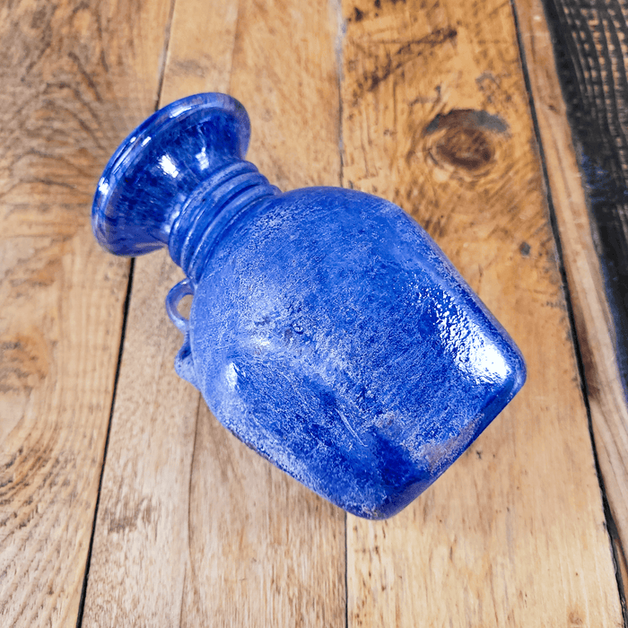 Schöne blaue Glasvase mit einer rauen Oberfläche. Die Vase wurde in den 70iger Jahren von Hand gefertigt. Die Vase wurde in einer antiken, jahrtausende alten Handwerkstechnik hergestellt. Sie hat eine schöne, einzigartige Oberfläche.