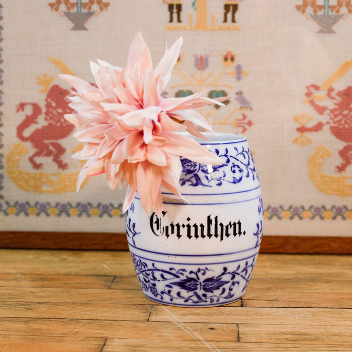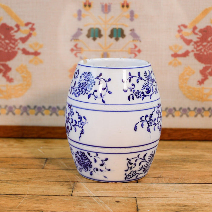 Very old vessel for food. The decorative white ceramic box is hand-painted. Their beautiful blue and white decor fits perfectly into a country house kitchen. It is suitable as a vase or for storage. A dekcel is no longer available.