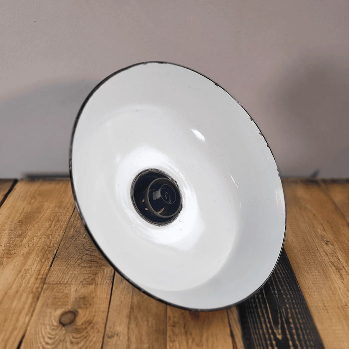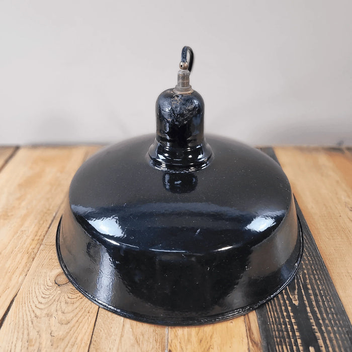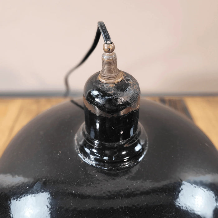 Tolle Industrie Deckenlampe aus einer alten Werkstatt. Die Lampe aus schwarzer Emaille ist in einem guten Vintage Zustand. Innen befindet sich eine E 27 Fassung. Die Hängelampe kann sofort  angeschlossen werden. ein schönes Stück Industriegeschichte.