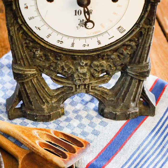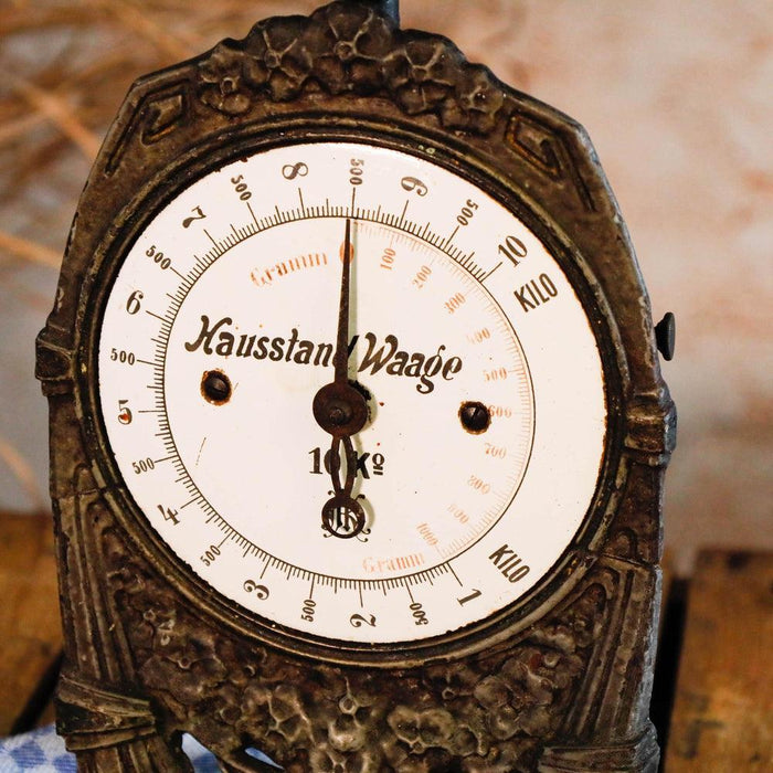 Great, rustic household scales, or as you can read "household scales" made of heavy metal. The very old scale is fully functional and can be adjusted again and again using a small wheel. The perfect scale for the country house kitchen, and for people who would like to weigh manually again. The scale weighs food up to 10kg. It has a matching bowl. The scale is not calibrated and has some signs of wear.